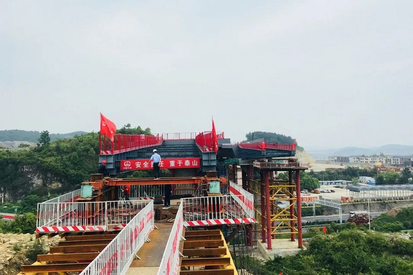 ▲右幅鋼箱梁主跨105m順利頂推