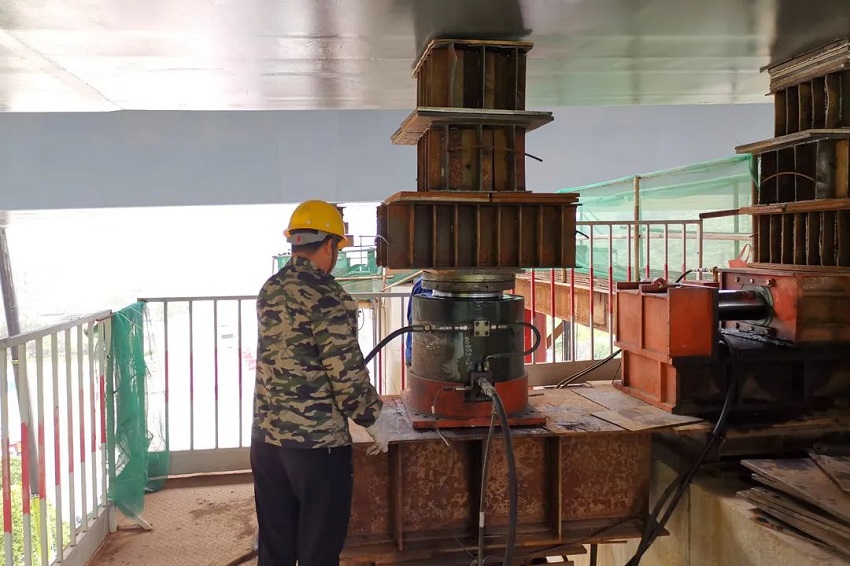 下壩大橋105m鋼箱梁采用的是單箱四室結構,共由19節總重量達2518噸的鋼節塊組成,一次頂推循環頂推26ml,共計70個循環。
