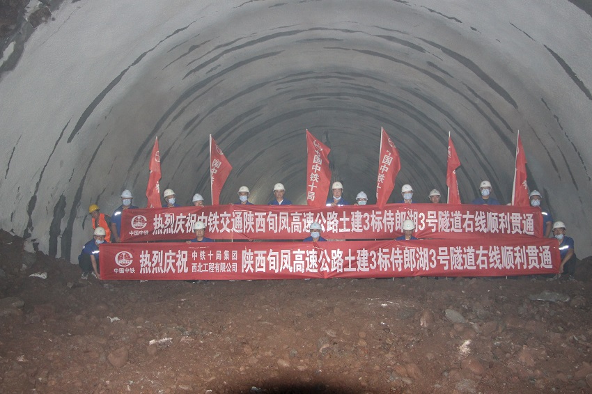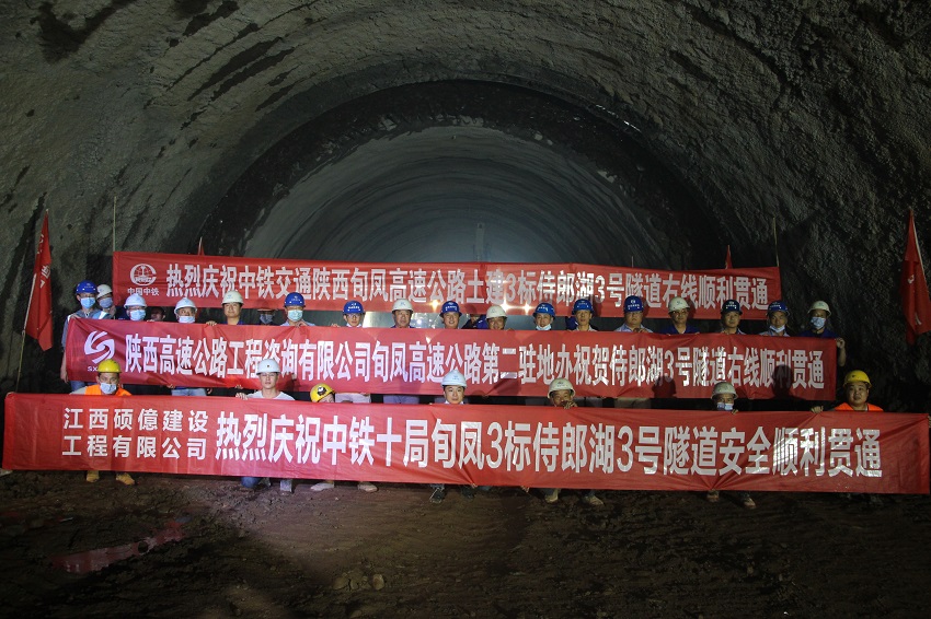 6月20日,繼侍郎湖1號隧道全線貫通、侍郎湖2號隧道右線貫通后,旬鳳高速土建3標(biāo)侍郎湖3號隧道右洞再次順利貫通。