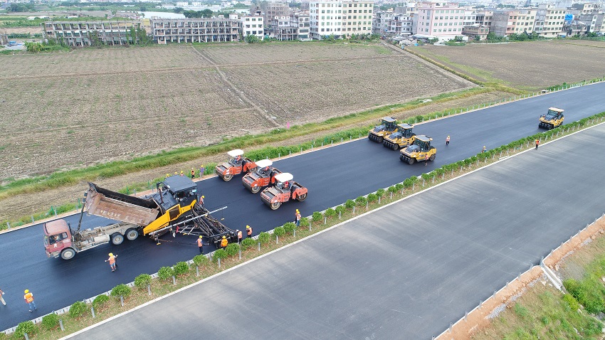 7月8日,汕揭項目第二作業面K27+750-K28+050段瀝青路面上面層試驗段鋪設順利完成。