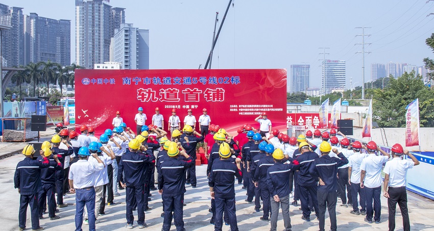 9月1日10時10分,在南寧地鐵5號線02標工程機電9工區金橋客運站鋪軌基地,軌道首鋪儀式現場彩旗飄揚,隨著“開始鋪軌”一聲令下,一節25m軌排被龍門吊穩穩吊起,緩緩下降安放至隧道內,標志著南寧地鐵5號線02標工程正式進入鋪軌大干熱潮。