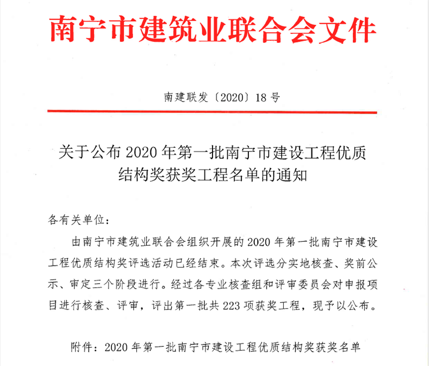 據(jù)悉,南寧市建設(shè)工程優(yōu)質(zhì)結(jié)構(gòu)獎是南寧市建設(shè)工程主體結(jié)構(gòu)質(zhì)量的榮譽(yù)獎,也是申報(bào)南寧市建設(shè)工程質(zhì)量“邕城杯”獎的必備條件之一。原則上每年度評選一次,一個單位工程只評選一次。