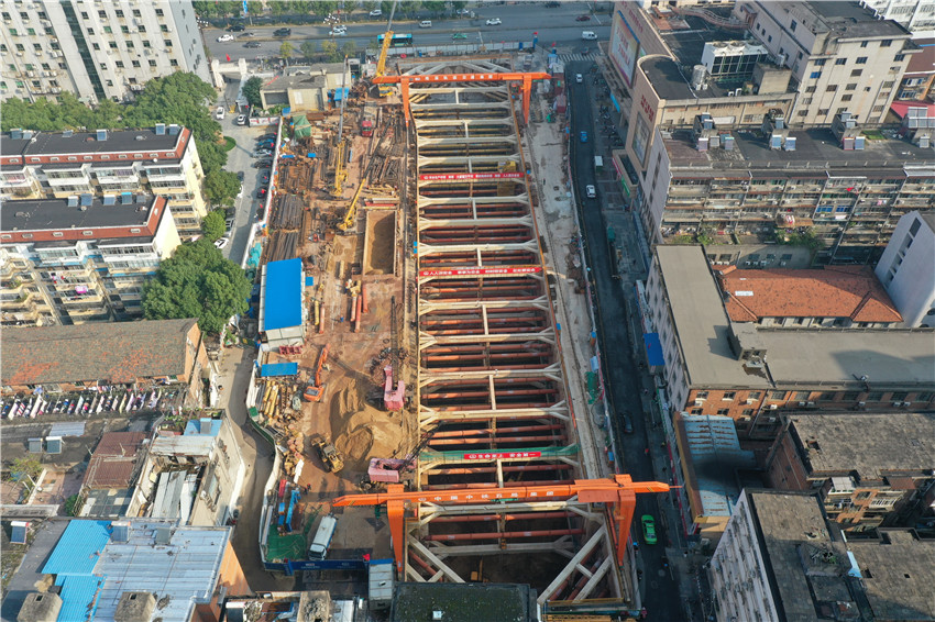 丁公路北站為地下三層島式車站,總長165.24m,站臺寬16.5m。該站受拆遷工作影響,開工建設工期嚴重滯后,在新冠肺炎疫情影響下項目工期愈加緊張。為盡快扭轉施工滯后局面,江西公司積極指導施工項目部加大人力物力投入,在土方開挖階段投入3臺大噸位吊車、2臺抓土機、2臺門式龍門吊、4臺挖掘機等十數臺設備,不間斷進行車站土方開挖作業,形成車站一邊進行土方開挖、一邊架設鋼支撐、一邊進行車站主體結構施工等多工序交叉作業場景,確保了該站順利完成土方開挖施工。