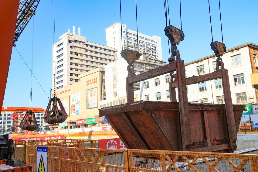 ▲丁公路北站采用龍門吊進行基坑內渣土出渣