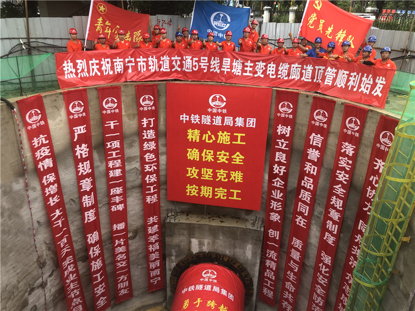 ▲南寧地鐵5號(hào)線旱塘主變電纜廊道頂管順利始發(fā)