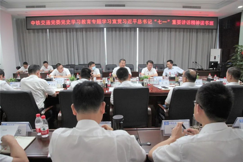 7月12日,中鐵交通黨委舉辦黨史學習教育專題學習宣貫習近平總書記“七一”重要講話精神讀書班,中國中鐵黨委黨史學習教育第六指導組組長裴清寧、副組長魏云祥列席參加讀書班,讀書班由中鐵交通黨委副書記(主持工作)、副董事長(主持工作)譚世俊主持,中鐵交通黨委副書記、總經理李建光及其他在家領導班子成員參加讀書班。