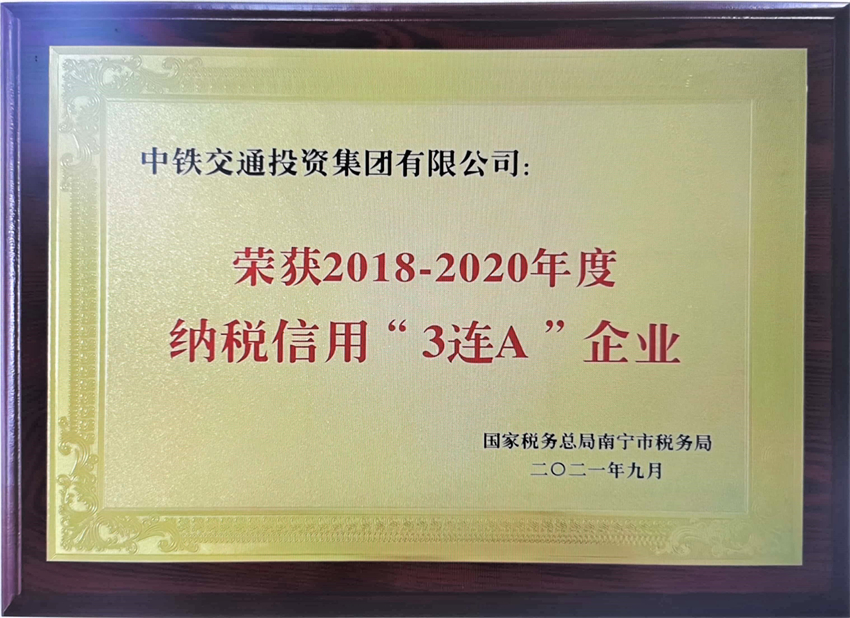 9月,中鐵交通被國家稅務總局南寧市稅務局評定為2020年度納稅信用等級A級企業,同時榮獲2018—2020年度納稅信用“3連A”企業稱號。