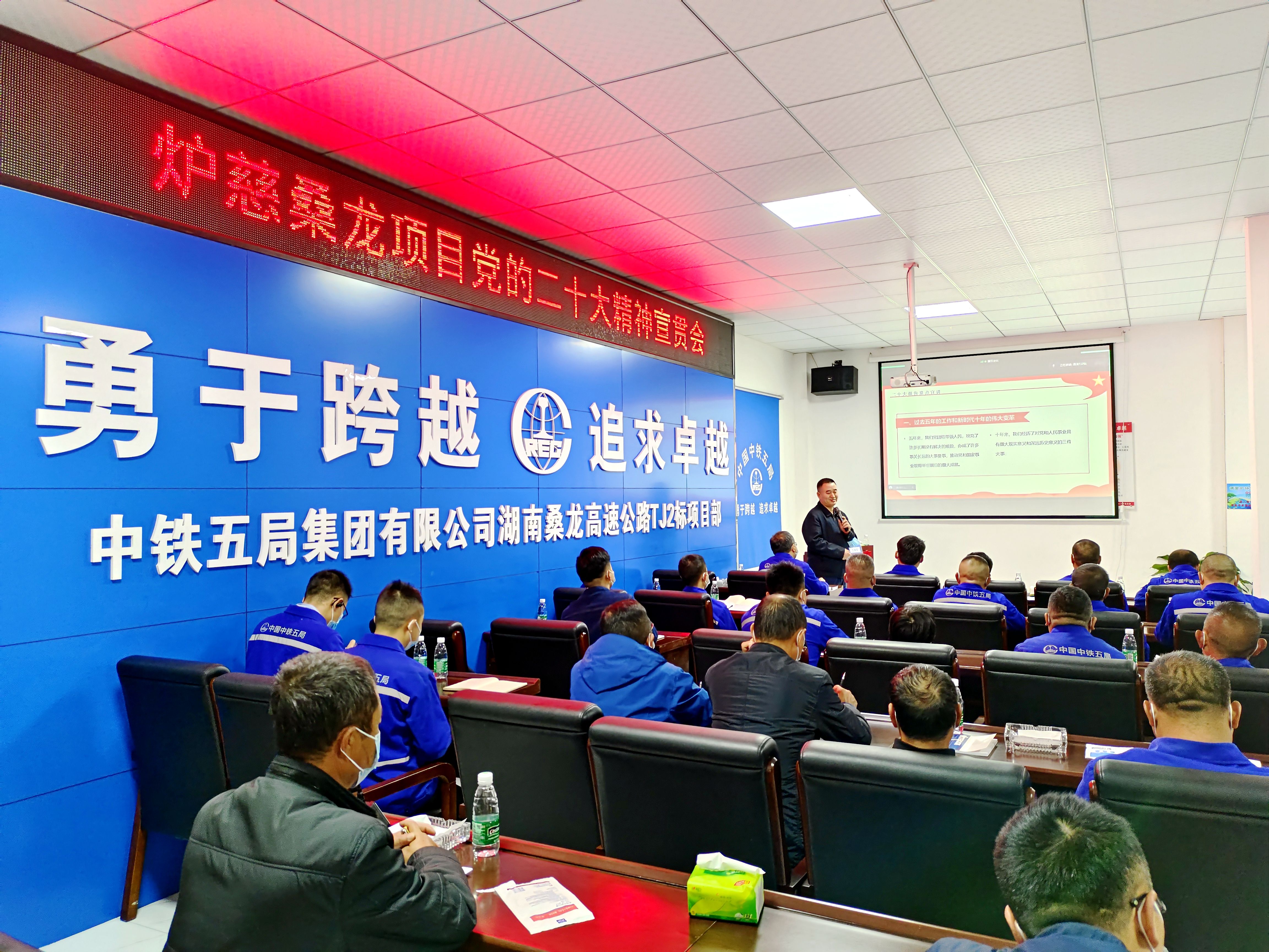 爐慈桑龍項目黨工委組織召開黨的二十大精神宣貫會,黨政主要負責人分別帶領全體黨員干部學習黨的二十大報告內容;營造良好學習氛圍,在項目駐地走廊、電梯內設置宣傳欄11塊,橫幅1條、易拉寶1個、展板4塊,并要求各參建單位在項目駐地、重點工程現場均設置相關宣傳內容;黨工委負責人到各參建單位開展《深入學習貫徹黨的二十大報告 為爐慈桑龍項目建設團結奮斗》主題宣講活動6場次,共計200余人參加宣講活動,迅速掀起學習宣傳貫徹黨的二十大精神熱潮。