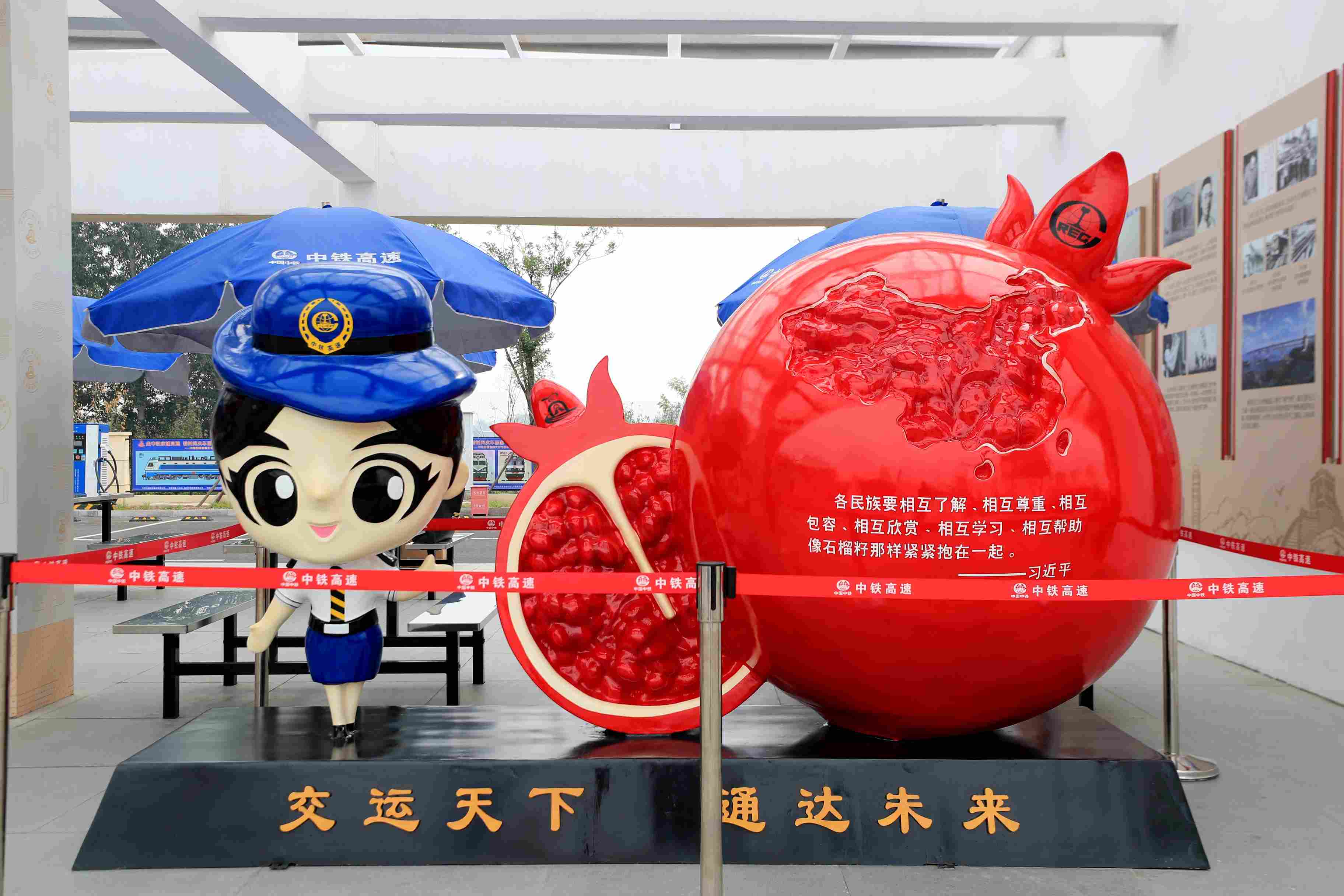 “民族大團結”石榴籽雕塑將中鐵高速吉祥物“路小美”與石榴籽意象相結合,造型生動、寓意鮮明,詮釋了服務區作為城市窗口喜迎八方來客、促進民族融合的功能定位,彰顯著企業的社會責任與人文擔當。